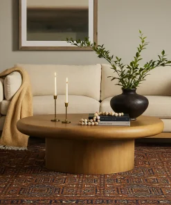 This modern round wooden coffee table features a smooth top and a minimalist base design that combines simplicity with elegance. Crafted from solid wood, it provides durability while maintaining a refined, natural appearance. Its clean lines and balanced proportions make it a versatile addition to both modern and classic interiors, serving as the perfect centerpiece for your living room.