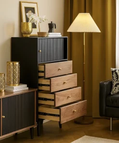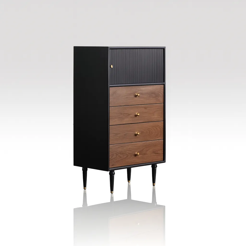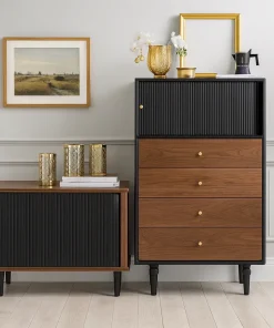 Designed with a modern aesthetic, this storage cabinet adds both function and character to the living room. Its slim rectangular shape and contrasting finishes make it a striking accent piece that blends easily with contemporary interiors. The cabinet includes a top compartment with a ribbed door for concealed storage, paired with several drawers that feature round knobs for smooth handling. Elevated legs enhance stability while giving the cabinet a sleek, lifted profile.