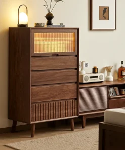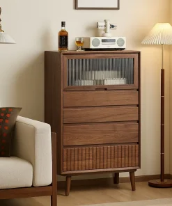 This storage cabinet features multiple drawers, a glazed door, and a patterned base, making it a functional and stylish addition to the living room.