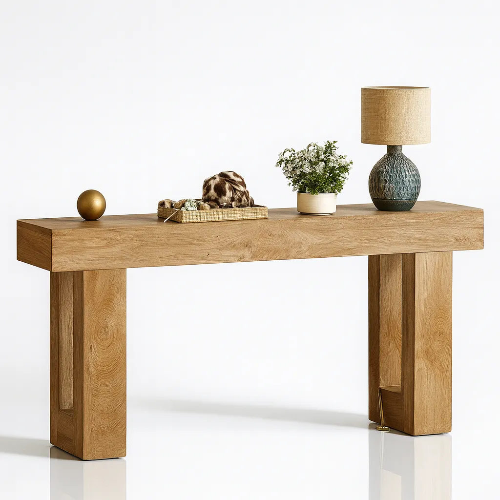 With its modern style, this wooden console table brings a simple yet structured look to any interior. The rectangular silhouette is designed to complement a wide range of decor themes, making it a practical addition to your home. Crafted from sturdy wood, the table showcases natural grain patterns that add warmth and character to its appearance. The solid legs provide stability, while the broad top surface is ideal for arranging decorative accents, lighting, or everyday essentials.