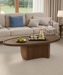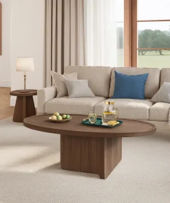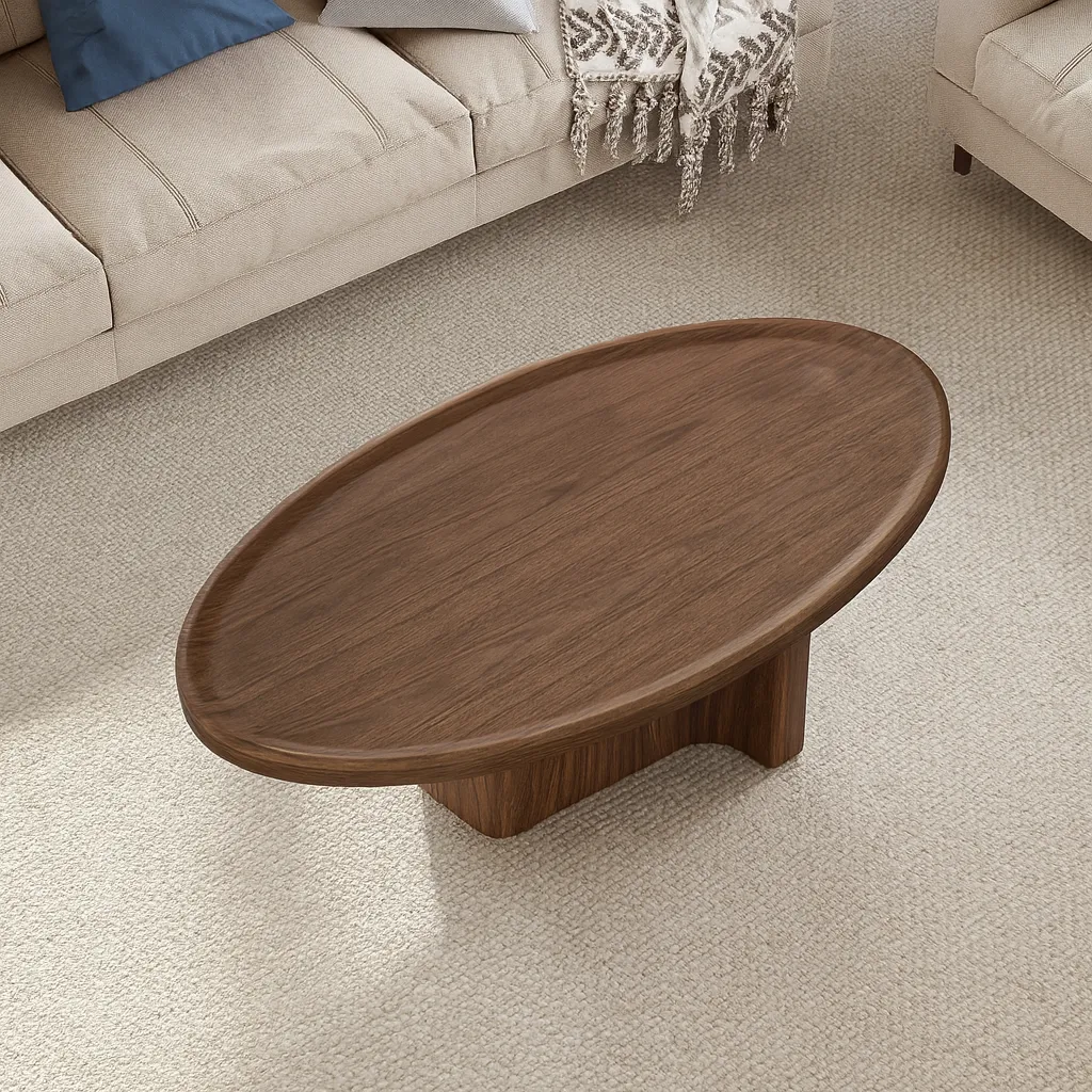 The modern wooden oval coffee table brings a sleek and contemporary look to your living room. Its carefully crafted oval top rests on a solid central support, ensuring durability and stability. The simple yet elegant design allows it to complement various interior styles, while its generous surface provides ample space for decor, books, or daily use. Perfect as a centerpiece, this coffee table combines practicality with refined craftsmanship.