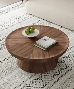 A contemporary round wooden coffee table featuring a smooth surface and a flared pedestal base. Its balanced proportions and refined finish make it an ideal centerpiece for living rooms, blending both functionality and style.