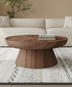 This modern round wooden coffee table is designed to bring elegance and practicality into your living space. The tabletop offers a wide, smooth surface perfect for displaying decor, books, or serving essentials, while the flared pedestal base ensures stability and visual appeal. Its minimalist yet distinctive design makes it versatile enough to complement modern, classic, or Scandinavian interiors. Crafted with precision, this table serves as both a functional furniture piece and a statement element for your home.