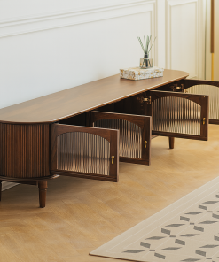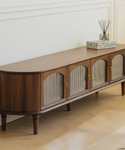 Modern wooden TV shelf with four frosted glass doors, bringing luxury and sophistication to the living room space.