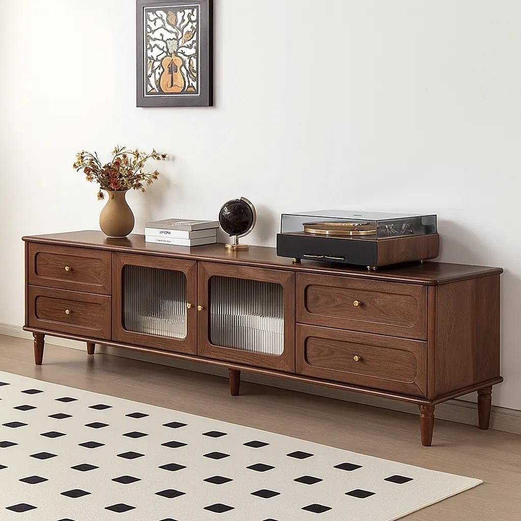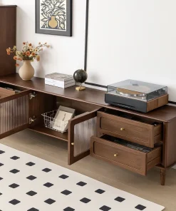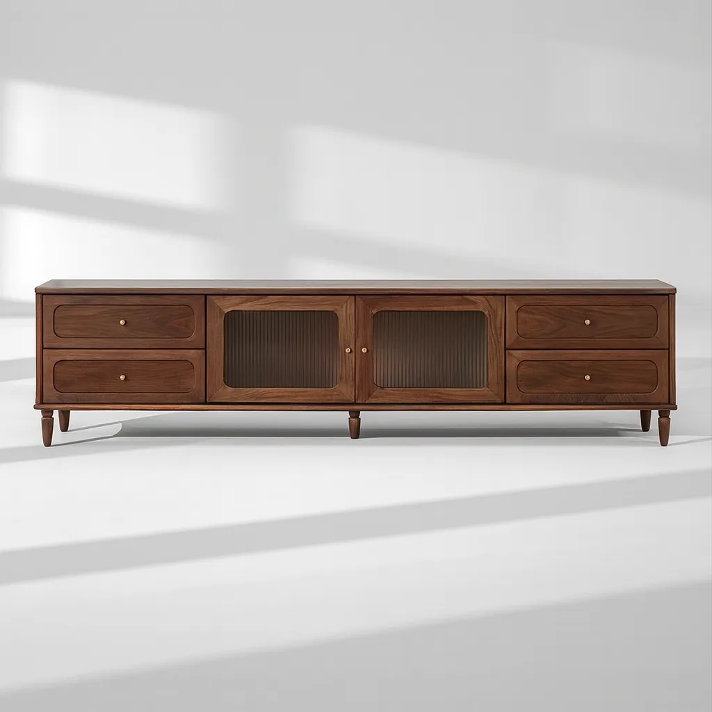 A modern tv stand with glass doors and side drawers, combining storage and display space for your living room.