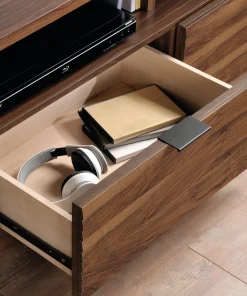 Modern Wooden TV Stand With Open Storage And Slatted Drawers